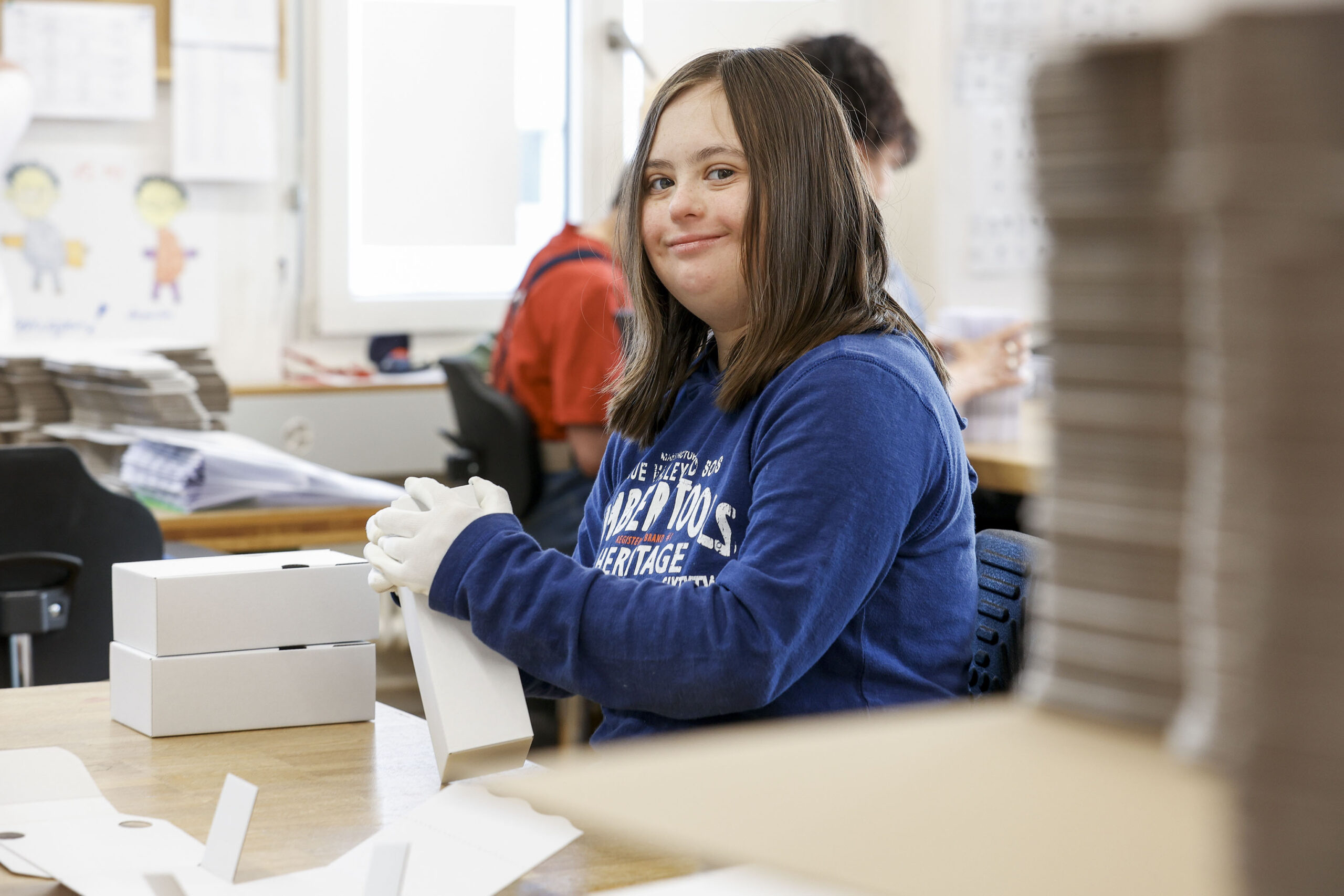 Falten, verpacken, verzieren: In unseren Industriewerkstätten verarbeiten wir alles, was exakte Handarbeit verlangt. 10’000 Briefe in Kuverts verpacken? Sehr gerne! 100’000 komplexe Schachteln für medizinische Geräte falten? Auch das machen wir. Gemeinsam sind wir ein starkes Team.